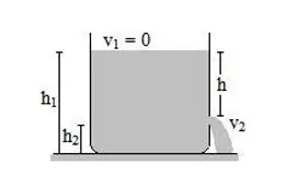 Apabila diterapkan persamaan Bernoulli pada titik 1 (permukaan wadah) dan titik 2 (permukaan lubang). Karena diameter kran/lubang pada dasar wadah berukuran jauh lebih kecil apabila dibandingkan dengan diameter wadah, maka kecepatan zat cair di permukaan wadah dianggap nol (v1 = 0). Permukaan wadah dan permukaan lubang/kran terbuka sehingga tekanannya berjumlah sama dengan tekanan atmosfir (P1 = P2). Dengan demikian, persamaan Bernoulli untuk kasus ini ialah :